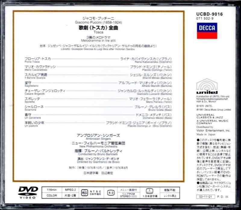 ≪DVD≫ プッチーニ:トスカ バルトレッティ=NPO; カバイヴァンスカ(S) ドミンゴ(T) 他 (UCBD9016)