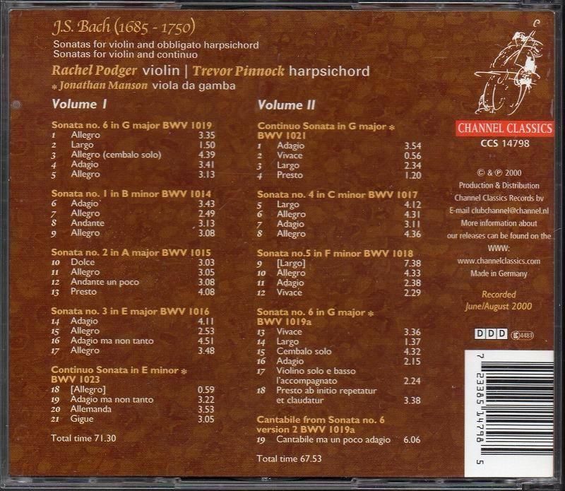 −[1]は3つの版が残されており、[9,10]ですべてを収めています。−バッハの無伴奏全曲録音で高い評価を得たポッジャーのCHANNEL CLASSICSへの第2作でした。−1739年 ジェノヴァのペザリニウス制作のvn、エムシュに基づくD. ウェイ制作のcembを使用。ピッチ A=415。