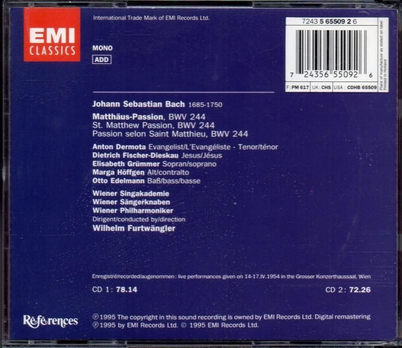バッハ:マタイ受難曲 (短縮版) フルトヴェングラー=WP 他 /L (EMI・2CD)