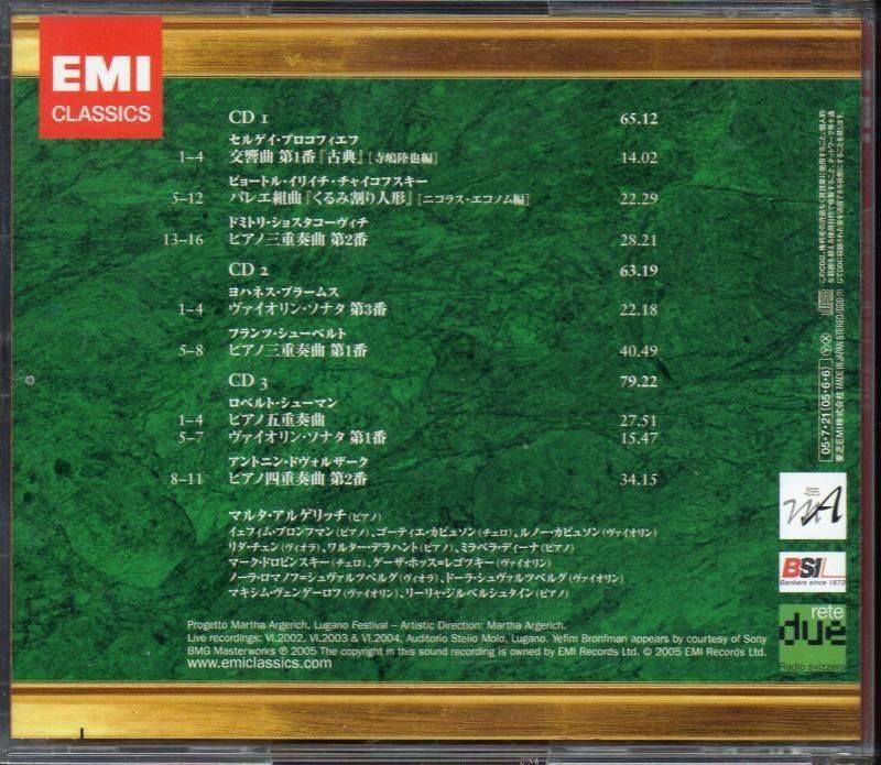 ■[1-3,6,7]マルタ・アルゲリッチ(p) [1,5]イェフィム・ブロンフマン(vn) [2]ミラベラ・ディーナ(p) [3,4]マキシム・ヴェンゲーロフ(vn) [3,5,8]ゴーティエ・カピュソン(vc) [4]リーリャ・ジルベルシュタイン(p) [5,6,8]ルノー・カピュソン(vn) [6]ドーラ・シュヴァルツベルグ(vn) ノーラ・ロマノフ- シュヴァルツベルグ(va) マルク・ドロビンスキー(vc) [7]ゲーザ・ホッス- レゴツキー(vn) [8]ワルター・デラハント(p) リダ・チェン(va)