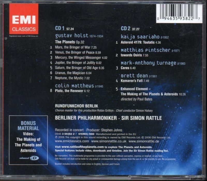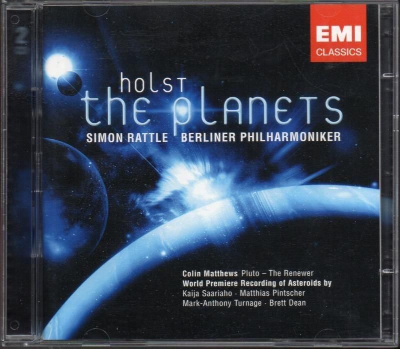 −[1]はラトル2回目の録音。−ケント・ナガノがコリン・マシューズ (1946-) に委嘱して、2000年に初演された「冥王星」はすでに多くの演奏者によって取り上げられ 認知度は高くなっているところですが、このアルバムの [DISC-2] に収録されている4曲は、宇宙をテーマにしたこのコンサートのために ベルリン・フィルが委嘱したもので、これは世界初演の演奏です。