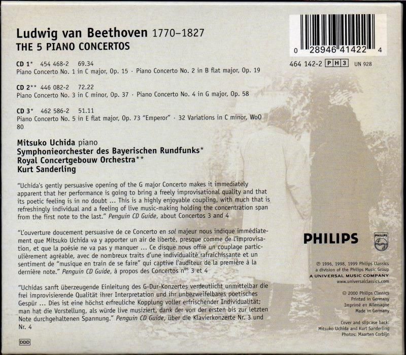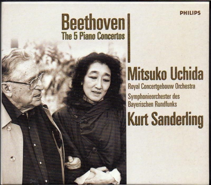 −バラで発売された既出のアルバム (454 468-2,446 082-2,462 582-2) を紙箱にまとめたもの。−いかにも内田らしい繊細で精妙な演奏。モーツァルトの延長線上にあると感じられる演奏ですが、ザンデルリングはそれを理解したオケ伴奏。「ベートーヴェンの協奏曲を弾くならザンデルリングとしか考えられない」と語ったという内田のラヴコールの意味を納得することができます。−ザンデルリングは90歳を迎えた2002年に引退しましたが、その最後のコンサートでは内田とモーツァルトの協奏曲を共演したとのことです。−仲睦まじいジャケット写真が印象的です。