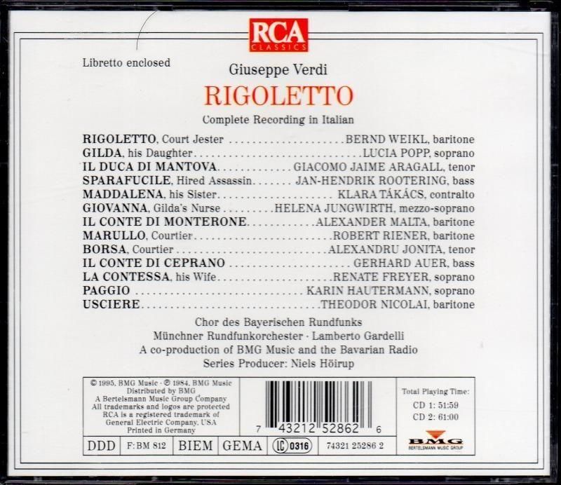 ■ベルンド・ヴァイクル(Br:リゴレット) ルチア・ポップ(S:ジルダ) ジャコモ・アラガル(T:公爵) クララ・タカーチ(A:マッダレーナ) ヤン- ヘンドリク・ローテリング(Bs:スパラフチーレ) ヘレナ・ユングヴィルト(MS:ジョヴァンナ) アレクサンダー・マルタ(Bs:モンテローネ) 他