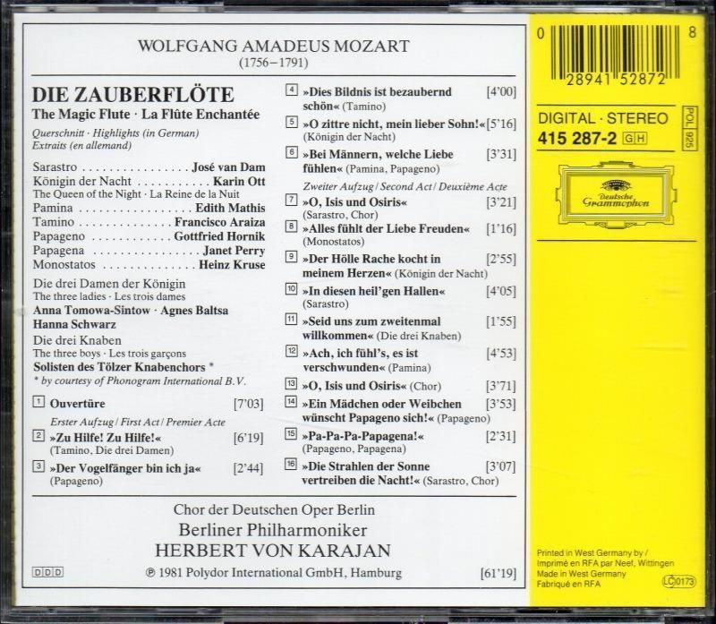 モーツァルト:魔笛 抜粋 カラヤン=BP; マティス(S) アライサ(T) 他 (DG)