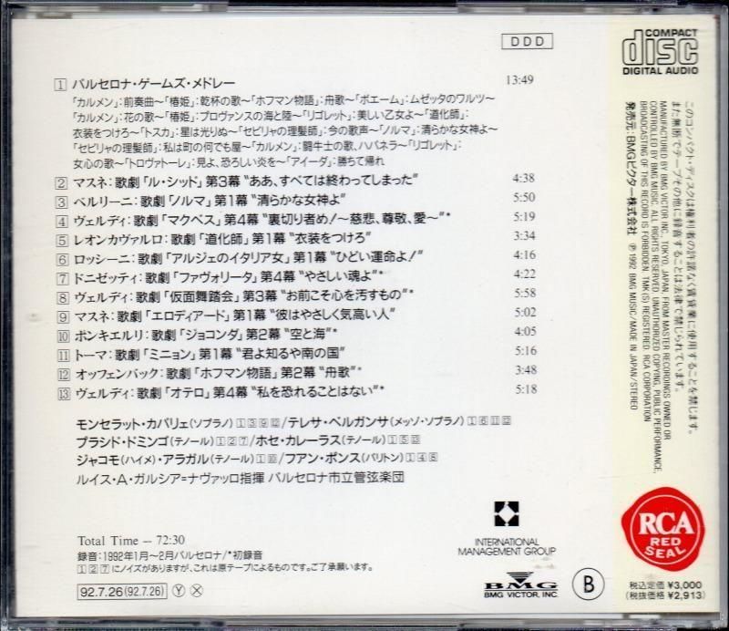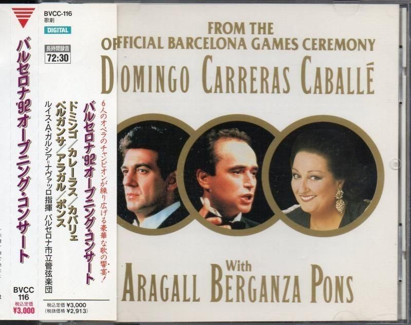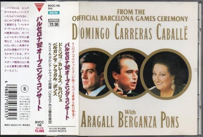 ☆1992. 1, 2 バルセルナにおける録音。−[1]はスペインの名歌手による楽しいオペラ名曲メドレー。ドミンゴとカレーラスとアラガルが 女心の歌や「見よ 恐ろしい炎を」などでメロディを分け合い、声を揃えて歌うことの驚き、スゴさ! これは1992年 バルセロナ・オリンピックの開会式で披露されたものとのこと。「勝ちて帰れ」を最後に持ってくる意味が理解できます。面白いことに オリンピック開会式のための公式録音にもかかわらず 当ディスクには欧文を含めて、ライナーノートにも一回たりとも「オリンピック」の言葉が出てきません。その一言を書くとなると莫大な金をIOCに支払わなければならなかったのでしょうか。国内盤アルバムタイトルも「バルセロナ '92 オープニング・コンサート」です。[2]以下も同時期に録音されたもの。これらはオリンピックで披露されたのでしょうか。あるいは このCDのために [1]のカップリングとして録音されたものでしょうか。最後のカレーラスの「オテロの死」など 通常のレパートリーではない曲なども興味深いところですが、私はなんと言っても ベルガンサのクセなく上品な、まさしく美声と言うしかない歌声に魅了されます。高音の力強さと美しさ、[6]でのアジリダ (もちろん派手なものではありませんが) の技術も素晴らしい。[12]のカバリエとの二重唱という珍しい組み合わせも大いなる聞きものでしょう。