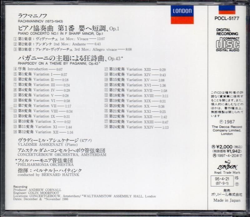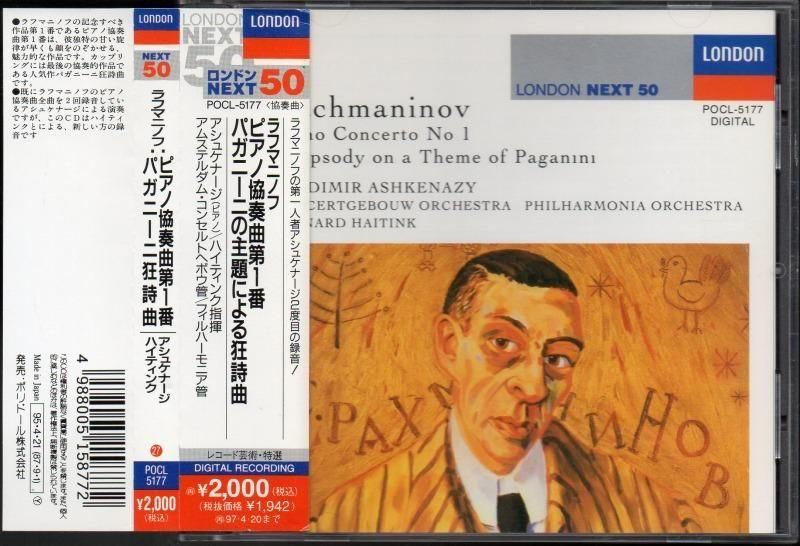 ラフマニノフ:ピアノ協奏曲第1番,パガニーニ狂詩曲 アシュケナージ(p) ハイティンク=KCO, PO (POCL5177)