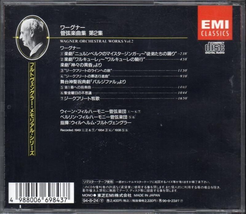 ーすべてセッション録音。EMI (エンジェル) のフルトヴェングラーのワーグナー管弦楽曲集は、1986年の初CD化で CC33-3386, 3387 の2集が発売。その後 1989年に初CD化分と同カップリングで CE28-5587, 5588 が発売されましたが、翌年 SP録音を中心とする第3集 TOCE6071 が発売されました。当盤は3回目の発売分 2集のうちの第2集。これまでの第2集の5曲に、第3集に収録されていたSP音源の[5,6]が加えられました。