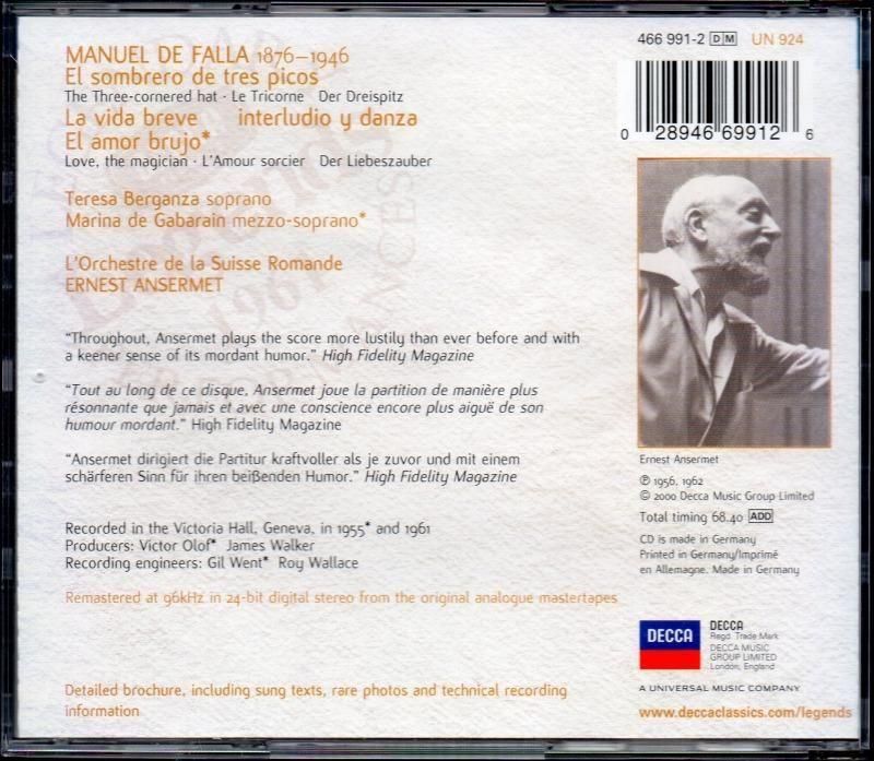 −アンセルメは[1]の初演者。現代的に精緻ではないながら、それだからこそ、舞台を想像させるような生き生きとした演奏を聞くことができます。雄渾なフォルテ、あるいは強烈なアッチェレランドも小手先ではなく堂に入っており、巧みな演出は初演者の貫禄というべきでしょうか。当時のDECCAの鮮明な音質も嬉しいところで、私はアンセルメの名盤というと [1]が真っ先に思い浮かびます。また若き日のベルガンサの歌声も大いなる魅力。