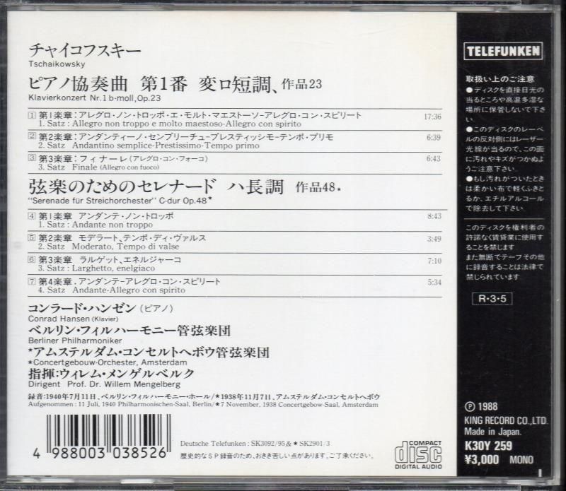 チャイコフスキー:ピアノ協奏曲第1番,弦楽セレナード ハンゼン(p) メンゲルベルク=BP, KCO (K30Y259)