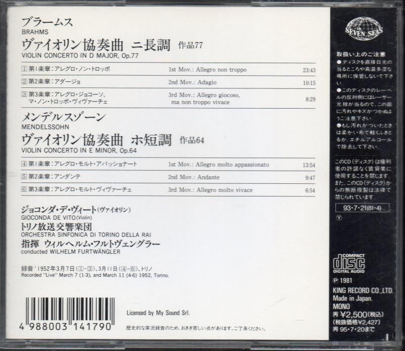 ブラームス,メンデ:ヴァイオリン協奏曲 デ・ヴィート(vn) フルトヴェングラー=トリノRAI /L (KICC2299)