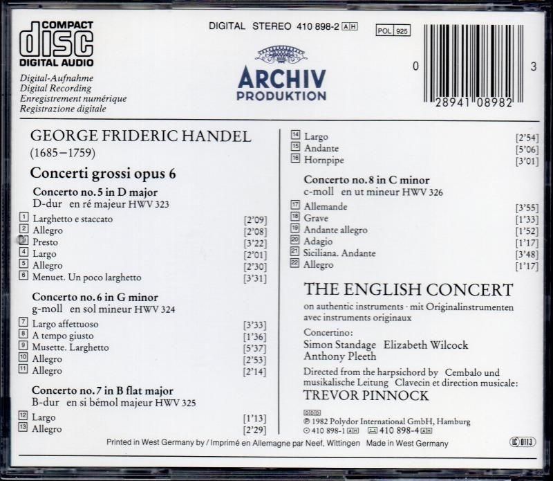 ヘンデル:合奏協奏曲Op.6より 第5〜8番 ピノック=EC (ARCHIV)