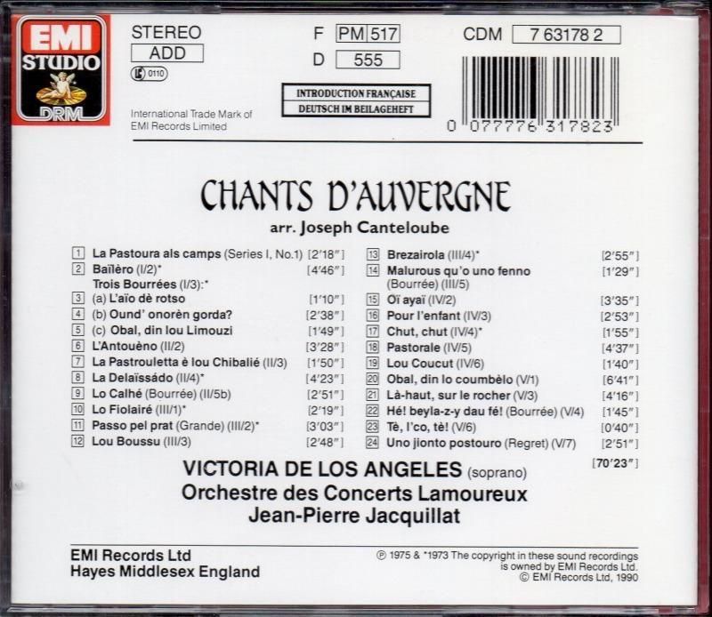 −カントルーブの故郷であるフランス中部の山間オーヴェルニュ地方の民謡を採譜・編曲した管弦楽伴奏付き歌曲集。古いフランス語の方言であるオック語で歌われます。ここでは第1集全曲([1-5])、第2集6曲より4曲 ([6-9])、第3集全曲 ([10-14])、第4集6より5曲 ([15-19])、第5集8曲より5曲 ([20-24]) がセレクト。全曲録音からの抜粋ではなく、これがロス アンヘレスのオーヴェルニュのすべて。LP2枚分をまとめたものです。−この曲集といえば、CD時代初期にキリ・テ カナワとフレデリカ・ヴォン スターデの2種が発売され、この曲集の人気をグッと高めたということがありましたが、このロス アンヘレスはそれ以前の代表的録音。テ カナワとヴォン スターデ盤が洗練されたコンサート風なのに対し、このロス アンヘレスは民謡風を感じさせるもの。オーヴェルニュの少女になりきったような甘く チャーミングな歌い口と感情表現、ユーモアの表出。さすがです。