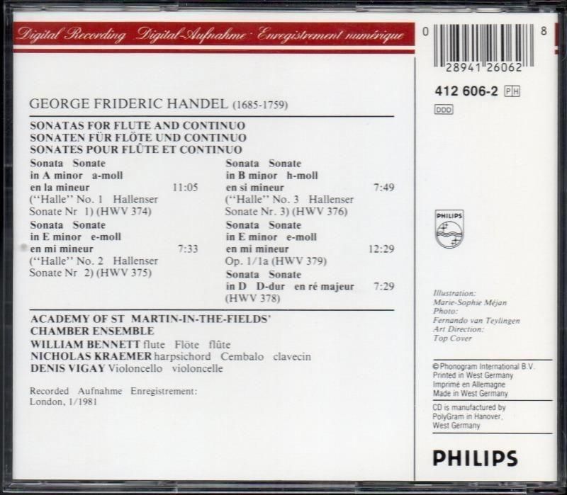 ヘンデル:フルート・ソナタ集 ベネット(bfl) ASMF室内ens (PHILIPS)