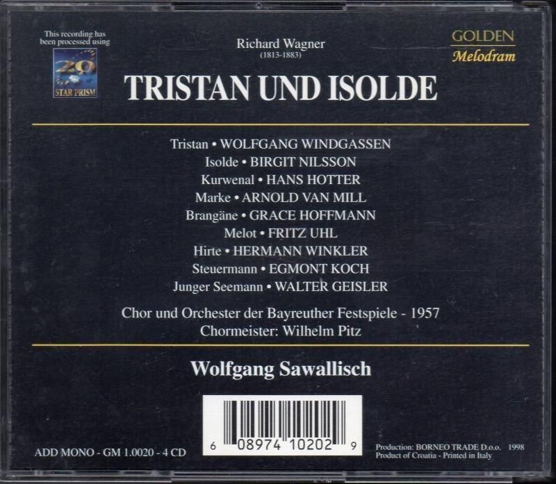 ■ヴォルフガング・ヴィントガッセン(T:トリスタン) ビルギット・ニルソン(S:イゾルデ) アルノルト・ファン ミル(Bs:マルケ王) グレイス・ホフマン(MS:ブランゲーネ) ハンス・ホッター(Bs:クルヴェナール) フリッツ・ウール(T:メロート) ヴァルター・ガイスラー(T:若い水夫) 他