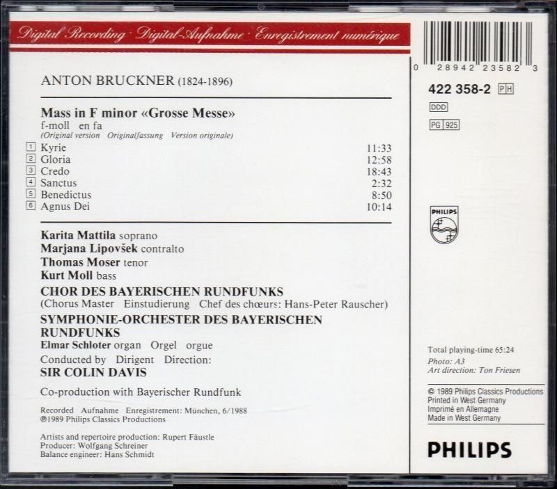 −デイヴィスのブルックナーの交響曲はライヴで3点発売されたことがありますが、セッション録音はなく、ミサ曲を録音したのは面白いところです。−ちなみにデイヴィスのブルックナー交響曲録音は、当録音と同じSOBRとの第7番 (1987年LIVE / ORFEO)、そしてロンドン響との第6番、第9番 (ともに2002年LIVE / LSO)。−またバイエルン放送響は1962年 ヨッフムの指揮で当曲を録音していました (DG)。
