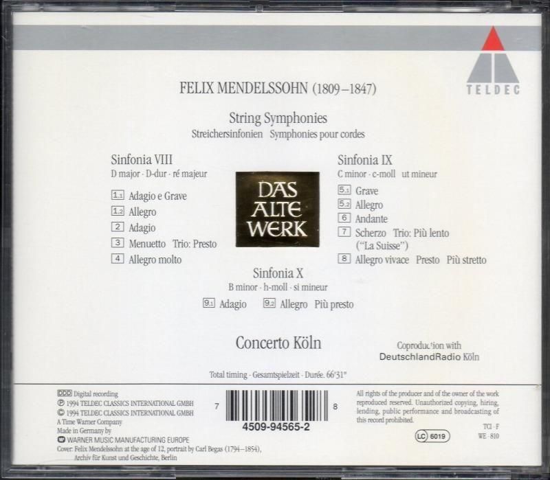 • サブ画像1:メンデルスゾーン:弦楽のための交響曲第8〜10番 コンチェルト・ケルン (TELDEC)ジャケット写真