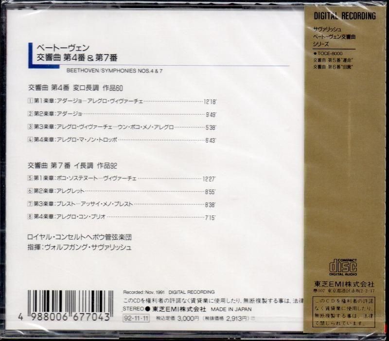 ベートーヴェン:交響曲第4,7番 サヴァリッシュ=KCO (TOCE8024)未開封