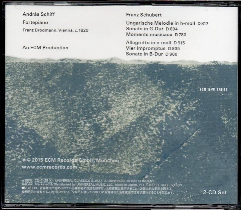 −フランツ・ブロードマン製 (1820年頃) フォルテピアノ使用。シフのECMへの初のシューベルト集でした。ただし2005年のライヴ・アンコール集で [1]を録音していました。−またシフはモダン・ピアノでこの6曲をDECCAに録音しており (1988〜93年)、それ以前の1978年来日時 [5]をファイアバードに録音していました。