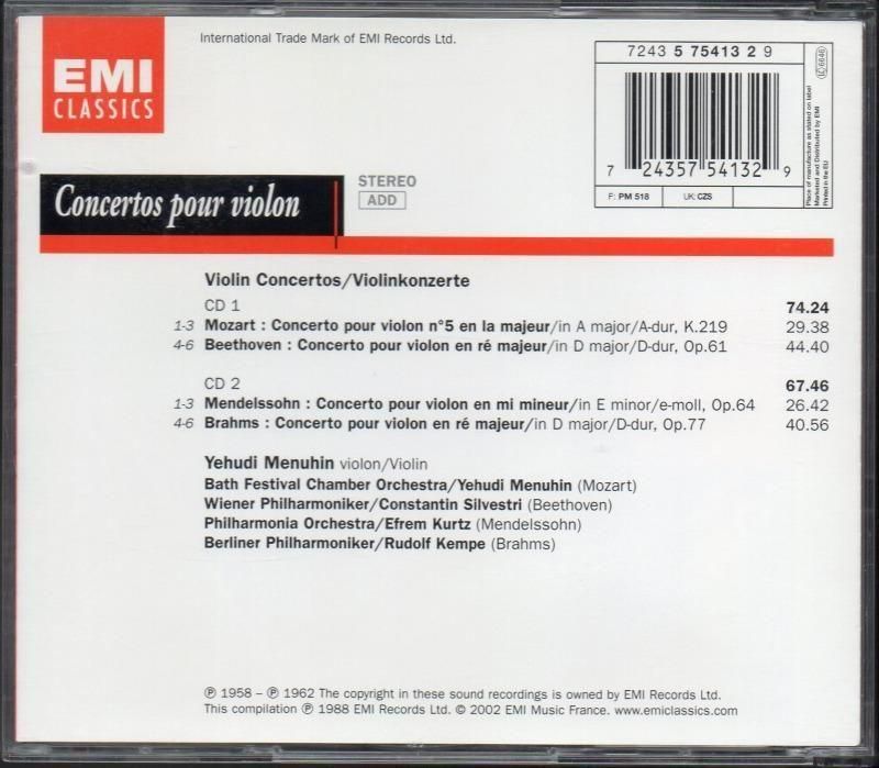 ベートーヴェン, ブラームス, モーツァルト, メンデ:vn協奏曲 メニューイン(vn) (EMI・2CD)